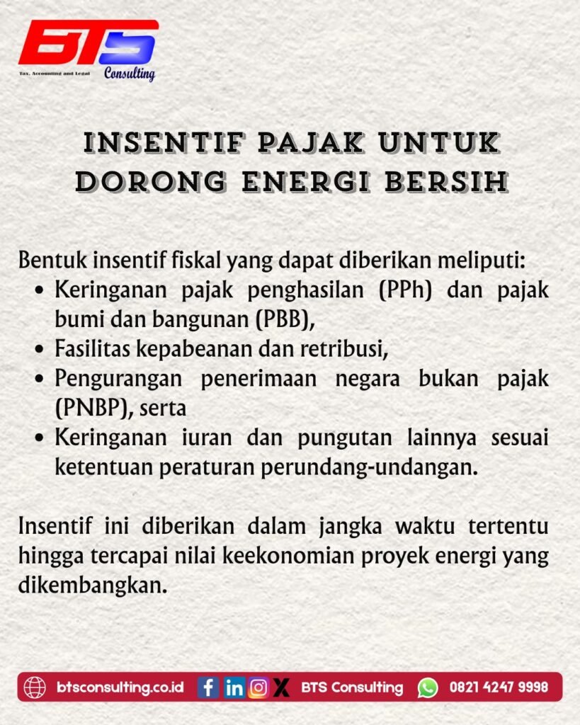 Insentif Fiskal: Diberikan untuk pengembangan EBT dan konservasi energi, mencakup keringanan PPh, PBB, hingga fasilitas kepabeanan.