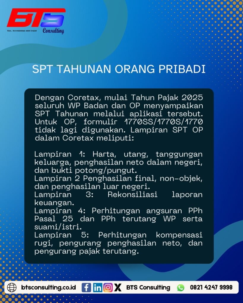 - SPT Tahunan PPh OP/Badan: Wajib disampaikan lewat Coretax, tidak lagi pakai formulir fisik/e-form lama. Lampirannya juga berubah total dan lebih rinci (lihat detail di postingan).